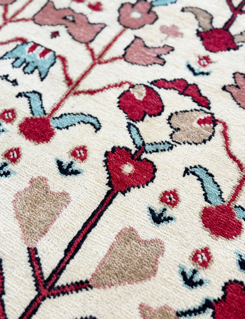 SUZANI RUGSEcru background with a design picked out in smashed pomegranate, pale blue, soft plaster pink.